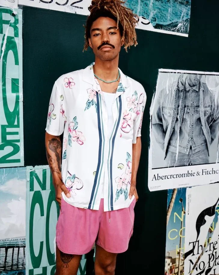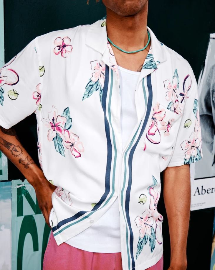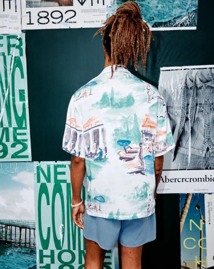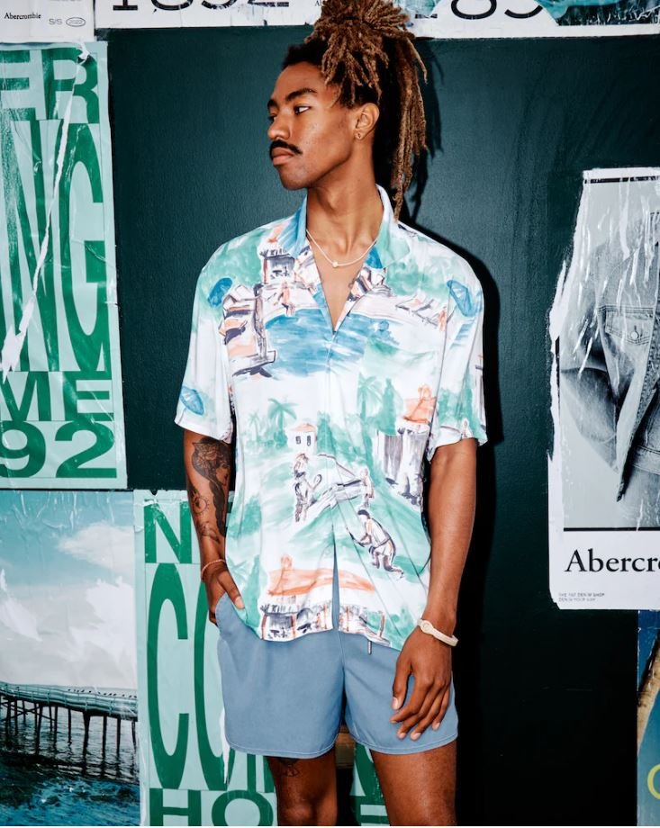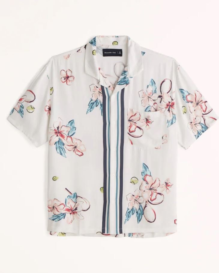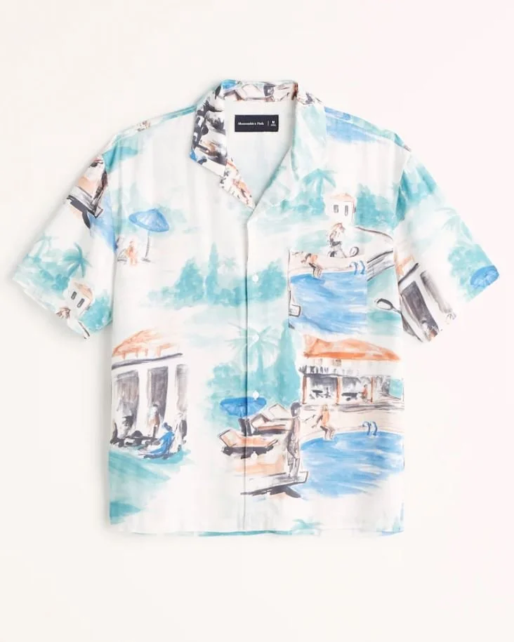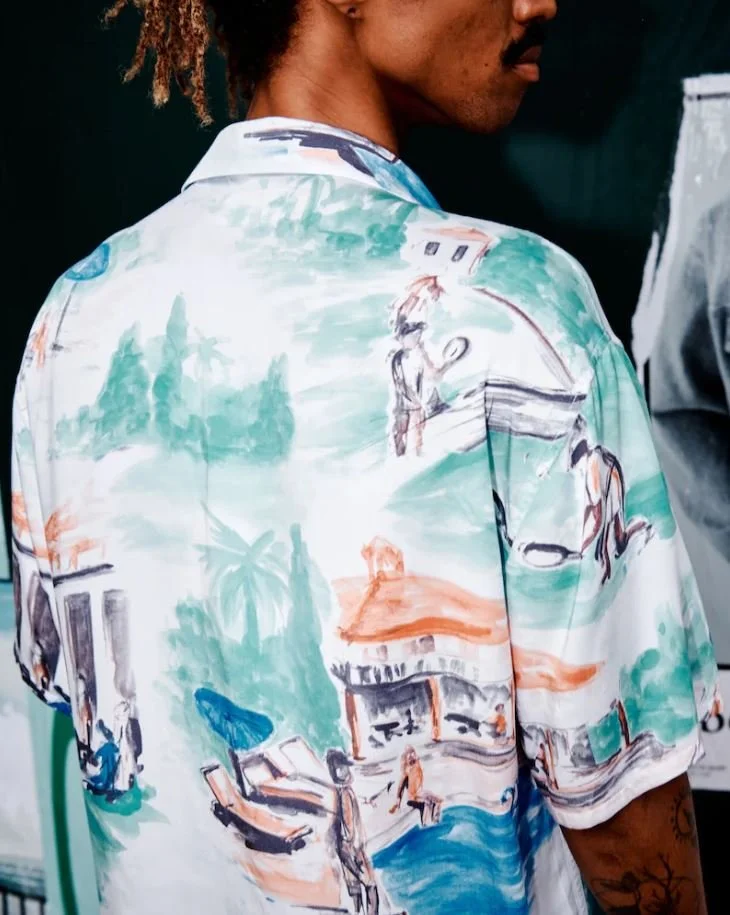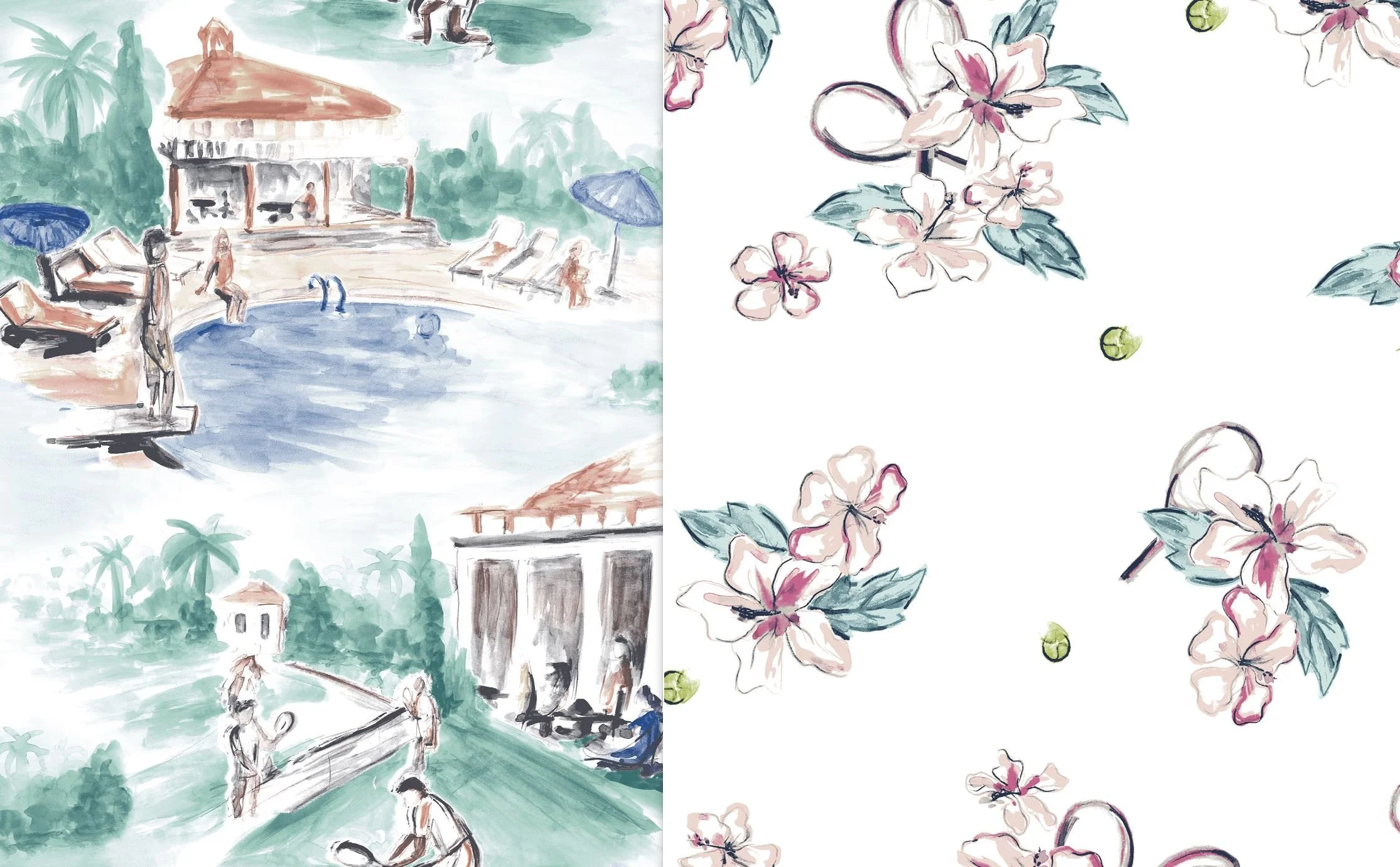 Retro - clubhouse vibe and tennis court aesthetic combines to create this high summer collection. The all-over scenic pattern and complementary tossed floral were hand-painted to emphasize a loose, easy style.